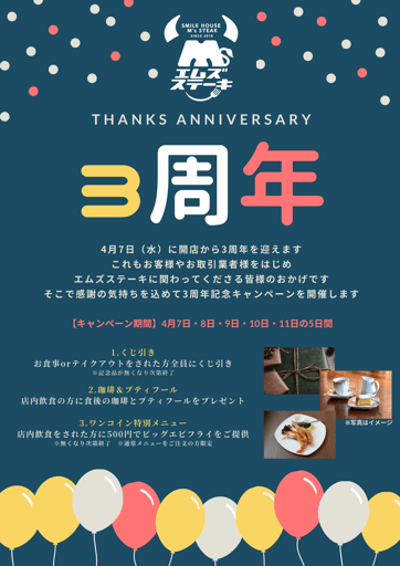 いつもエムズステーキをご利用頂きましてありがとうございます。4月7日をもちまして、開店から3周年を迎えることになりました。これもお客様やお取引業者様をはじめ、エムズステーキに関わってくださる皆様のおかげだと考えております。