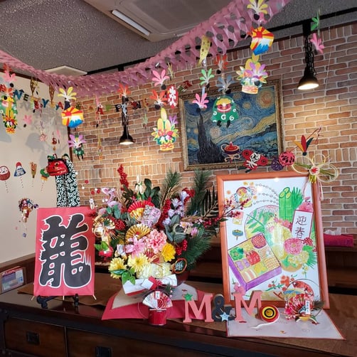 写真は、スタッフが作ってくれたお正月の飾りです。エムズステーキにご来店の際には、是非ご覧いただければ幸いです。
