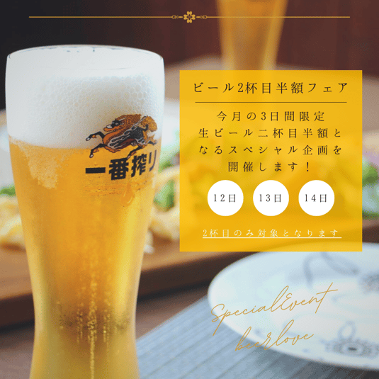 ■生ビール二杯目半額フェア