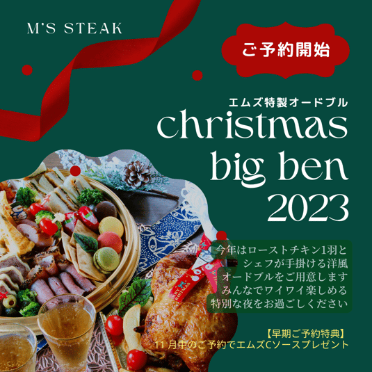 エムズのクリスマス特製オードブル『Xmas big ben 2023』は、11月中にご予約いただいた方にご予約特典として、エムズCソースをプレゼント致します。