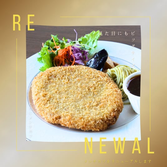 2024/09/27 わらじメンチカツ いつもエムズステーキをご愛顧頂きましてありがとうございます。 定番メニューとして好評を頂いています「メンチカツ」をこの秋リニューアルします。 見た目にもワンランクアップして、さらに調理工程を改良して味わいや食べ応えも向上しました。そしてメンチカツからネーミングも変更して、「わらじメンチカツ」となります。 ワンランクアップしたわらじメンチカツを是非味わってもらえたらと思います。 ■リニューアルメニュー わらじメンチカツ 1480円 tagPlaceholderカテゴリ: