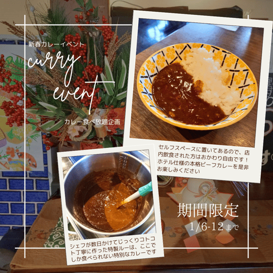 さて、6日から12日までの期間限定で「新春カレーイベント」を開催ます。店内飲食された方限定で、シェフ特製カレーの食べ放題企画となります。じっくりコトコト煮込んだ特製ルーを、セルフサービスで提供していますので、是非楽しんでもらえたらと思います。