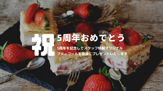 期間中、店内で飲食をされた方に、食後のデザートとしてプティフールをプレゼントいたします。スタッフが周年記念の為にお作りする特製スイーツとなりますので、是非お楽しみ頂ければと思います。
